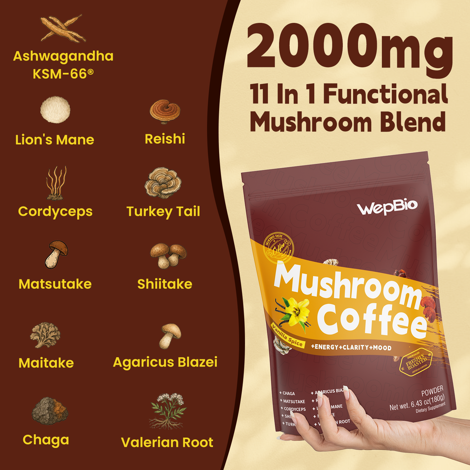 The main ingredients of Wepbio Mushroom Coffee are premium Arabica coffee and a blend of 11 functional mushrooms, including Lion’s Mane, Cordyceps, Reishi, Maitake, Turkey Tail, Chaga, Agaricus Blazei, Matsutake, and Shiitake, combined with Ashwagandha KSM-66® and Valerian Root.